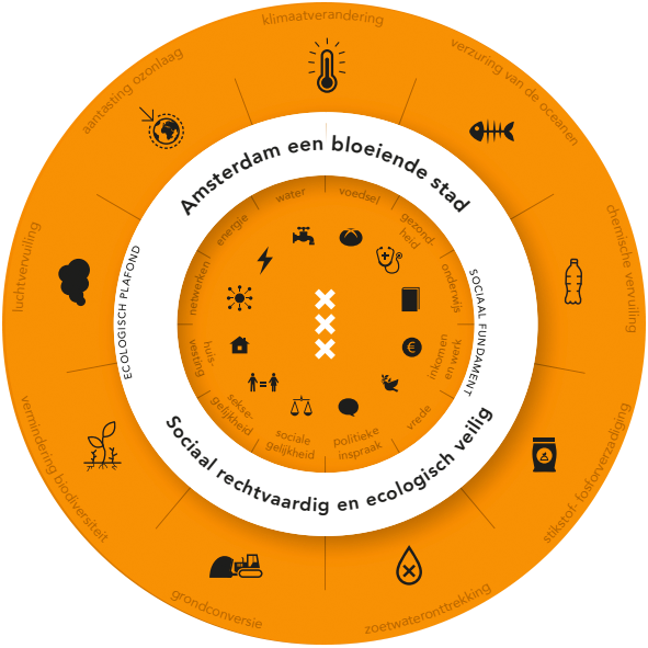 Op verzoek van de gemeente maakte Raworth ook een advies op maat voor Amsterdam. De bijbehorende stadsdonut dient als een kompas waaraan de gemeente haar beleid kan toetsen.