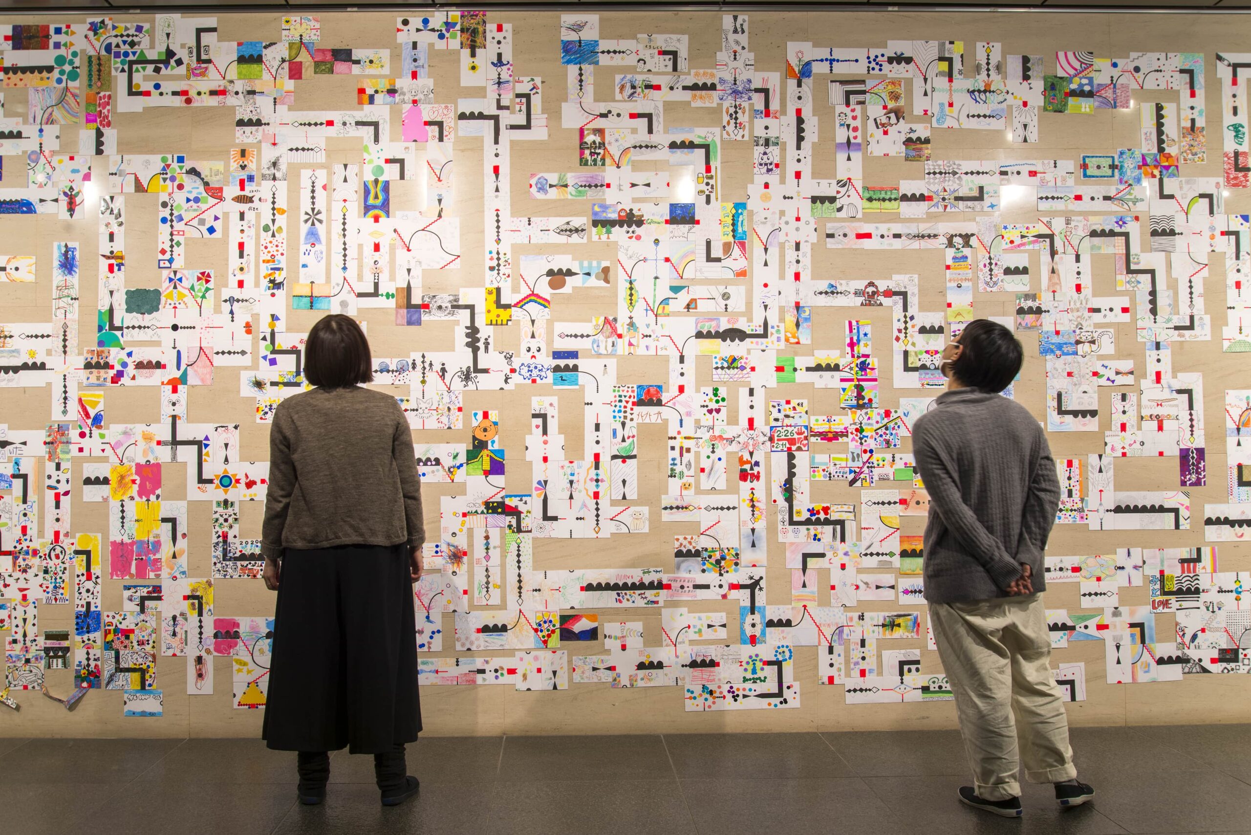 Het werk van het Japanse kunstenaarsduo BOB ho-ho valt direct op als je de overdekte passage van De Hallen inloopt. Het duo ontwerpt simpele ansichtkaarten waarop mensen hun eigen creativiteit kunnen loslaten. De ansichtkaarten zijn verspreid in Amsterdamse buurt-en verzorgingshuizen. Samen vormen deze kaarten een nieuw kunstwerk, die wordt aangevuld met ansichtkaarten van bezoekers.