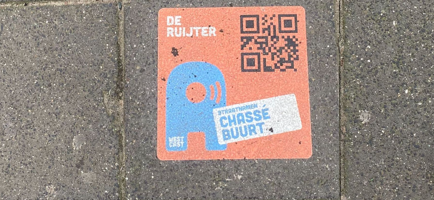 Verhalen die het vertellen zeker waard zijn, maar worden ze met dit initiatief ook vaker verteld? De stoeptegels laten in ieder geval niets duisters merken. Op het feloranje plaksel staat naast de QR-code een blauw symbool dat het meeste lijkt op de letter A. Ook is er ruimte voor woorden als ‘De Ruijter’ en ‘Chassébuurt’. Links onderin de tegel is met ‘Westcast’ nog plek voor wat branding van het initiatief dat deze verhalen mogelijk maakt.