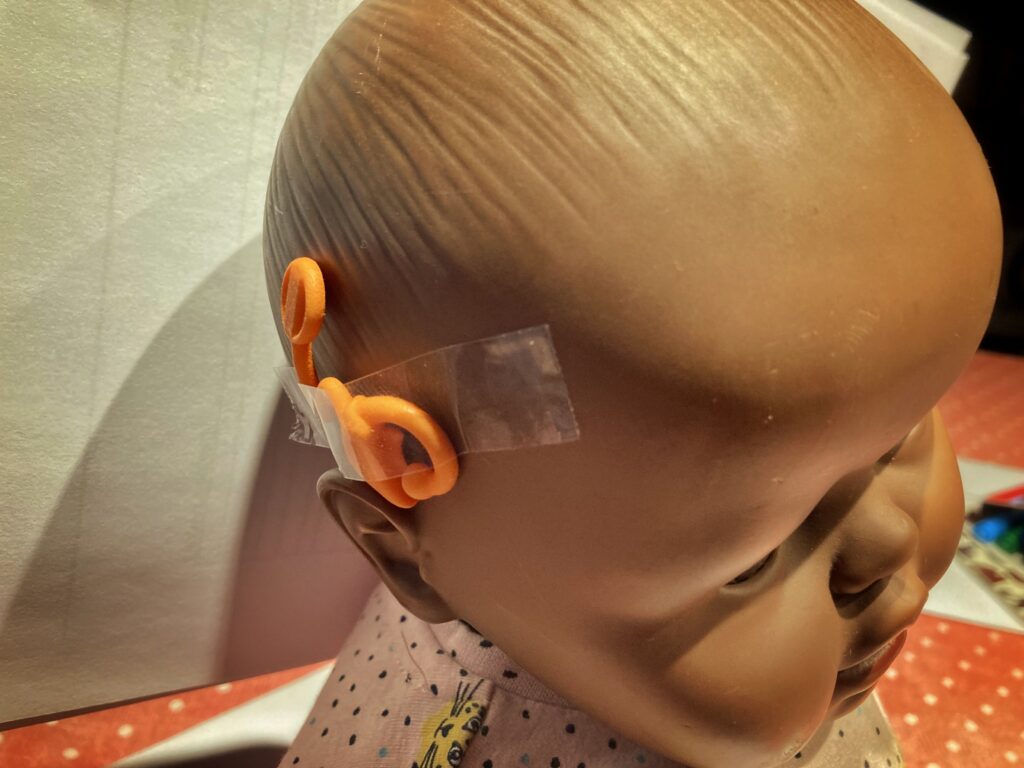 Pop met 3D-geprint gehoorapparaatje van moeder Carolien.