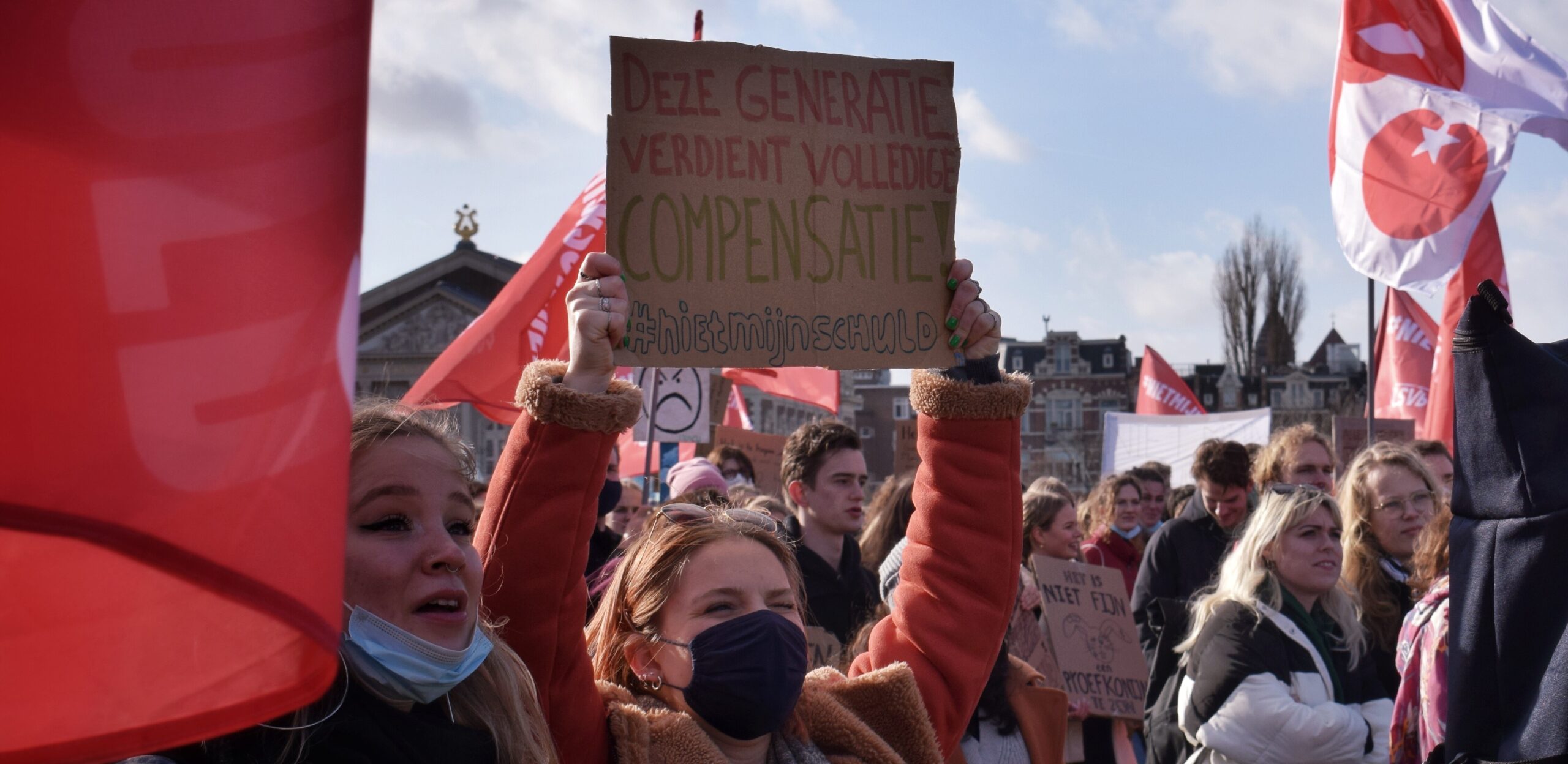De rode vlaggen van de Landelijke Studentenvakbond (het LSVb) wapperen in de koude wind. Het merendeel van de studenten kijkt gefrustreerd naar het podium. Een van de sprekers schreeuwt: ‘Wij willen geen fooi! Pechgeneratie, we eisen compensatie!’ De menigte joelt en juicht.