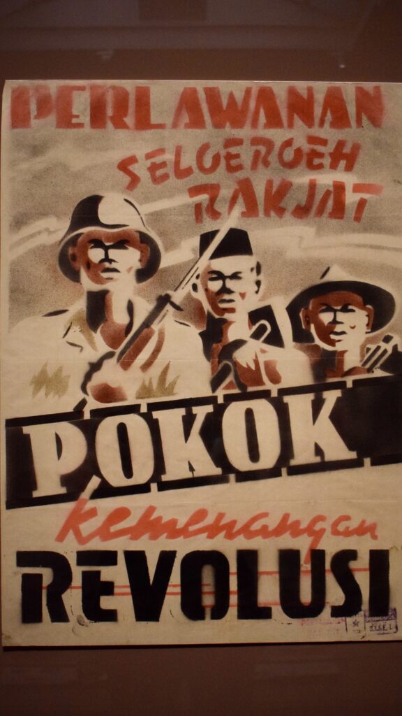 De donkere, eerste zaal van de tentoonstelling brengt de bezoeker terug naar 17 augustus 1945. Op deze dag roept Soekarno de staat Indonesië uit op de veranda van zijn huis, na meer dan drie eeuwen van koloniale overheersing. Fotojournalist Soemarto Frans Mendur legt de sobere ceremonie vast. Hij moet huilen bij het horen van het volkslied. Op de muur in het Rijksmuseum volgen de grote projecties van Mendurs zwart-witfoto’s elkaar snel op. Een gewelddadige onafhankelijkheidsstrijd, de revolusi, van ruim vier jaar volgt.