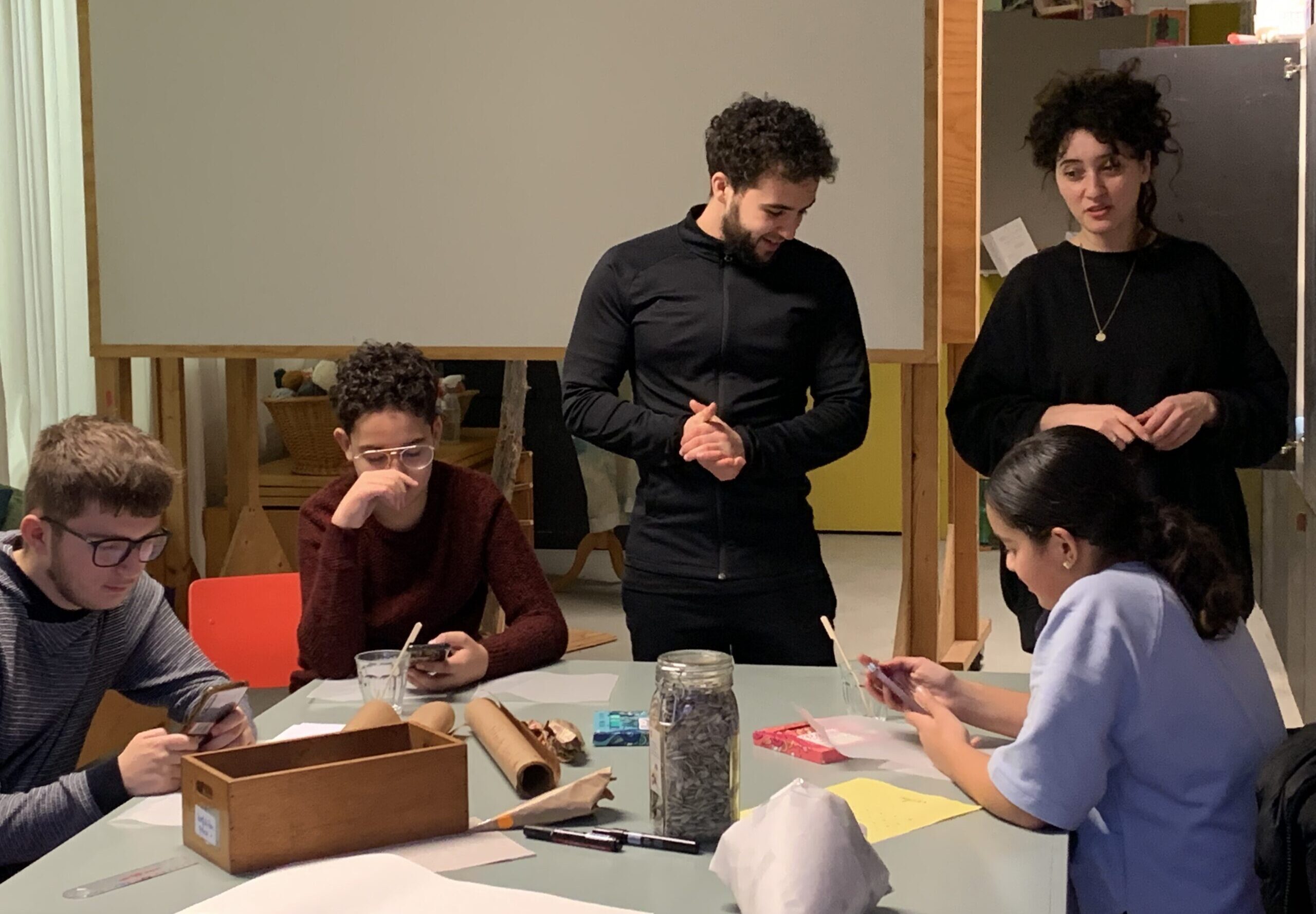 Op tafel liggen grote vellen papier en een pot zonnebloempitten. Twee andere begeleiders, Janine Toussaint en Hannah Oul-Hadj, delen stiften uit. Vandaag gaan de jongeren aan de slag met een nieuw product: de ‘pipa’s’, een gezonde snack gemaakt van zonnebloempitten.