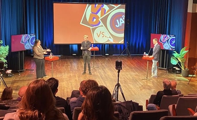 De Balie organiseerde dinsdagavond voor de tweede keer verkiezingsdebatten, de VVD tegen JA21 en Volt tegen de SP. Annabel Nanninga (JA21) probeert met gevatte oneliners onder de huid van Daan Wijnants (VVD) te komen. ‘De energietransitie breekt de rug van de Amsterdammer.’