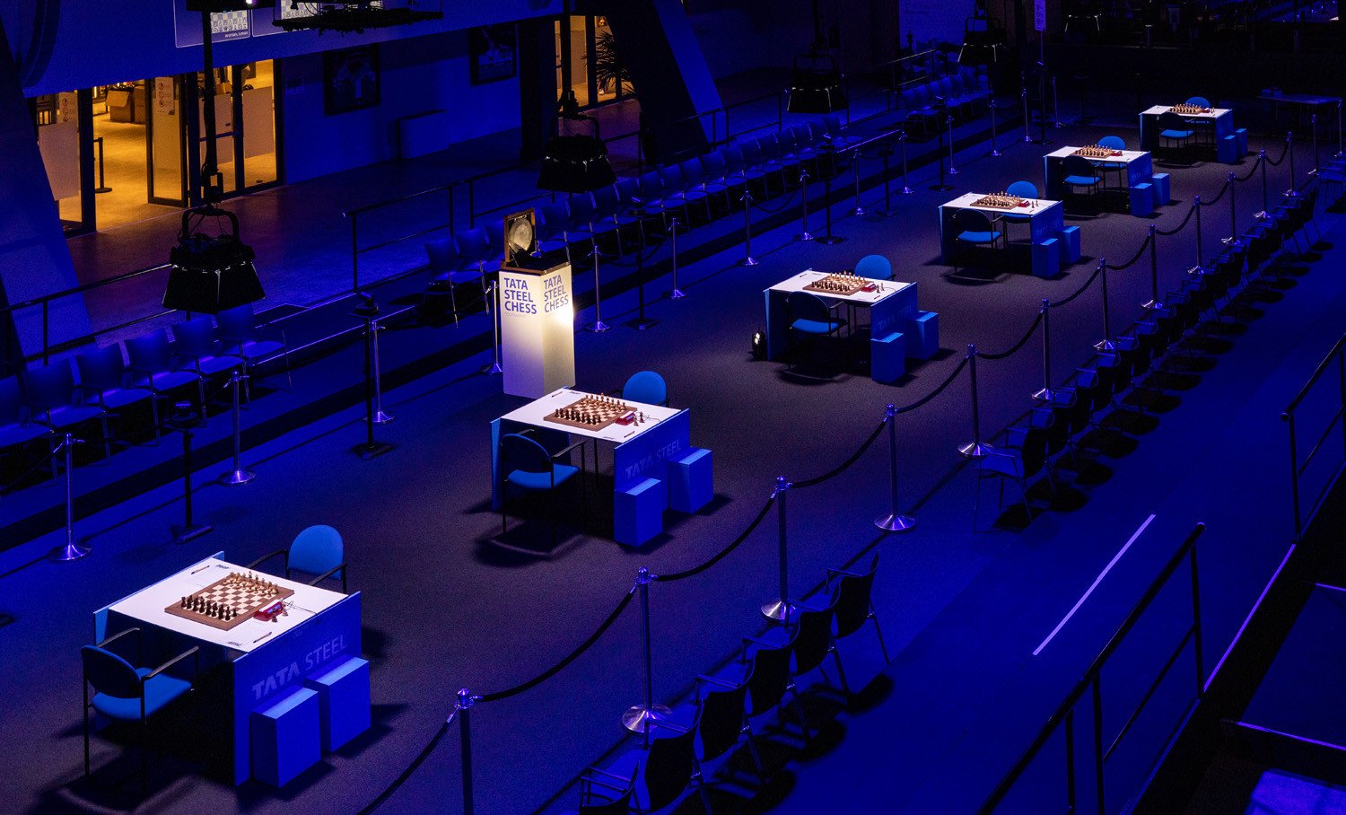 Geen grote vlaggen of opvallende borden, zelfs het vinden van de juiste ingang is een uitdaging. De buitenzijde van de Johan Cruijff Arena geeft geen enkele schijn dat binnen een ronde wordt gespeeld van het Tata Steel Schaaktoernooi. Pas bovenaan de roltrap op de vierde etage benadrukt een banner dat het hier om topsport gaat: ‘Normal people have to see Naples behore they die… but a Chess Grandmaster has to win Wijk aan Zee first.’
