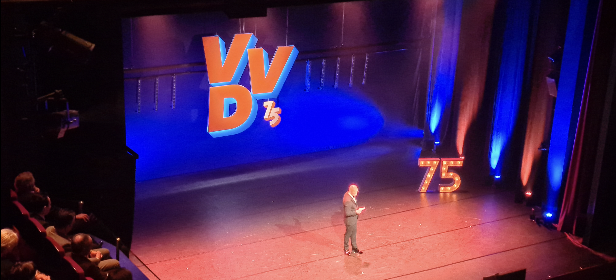 De VVD vierde in het DeLaMar Theater haar 75e verjaardag. Over een mogelijke opvolger van Rutte werd niet gesproken. ‘Er lopen hier veel mogelijke opvolgers, maar we hebben nog geen vacature.‘