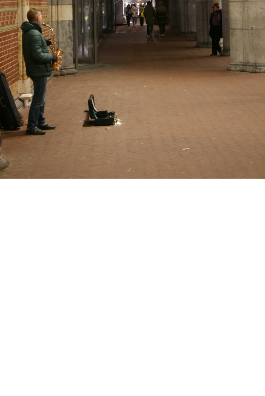 Anatoly dagdroomt vooral over de toekomst van anderen. Wil hij zelf dan niet weer professioneel muzikant worden? ‘Het hangt ervan af wat je daaronder verstaat. Ik overleef door muziek te maken, dus zie ik mezelf als professionele muzikant. Bovendien is het in Nederland moeilijk om als jazzmuzikant bij een ensemble te komen. Er is meer plek voor klassiek opgeleide musici.’ Wellicht dat er eens iemand van een ensemble door de passage loopt en hem erbij vraagt. Anatoly lijkt zich er geen zorgen over te maken. Of misschien een beetje: ‘Ik ben niet sterk genoeg om dagen achter elkaar in deze kou te spelen.’ Zijn stramgespeelde vingers schroeven zijn saxofoon uit elkaar. De komende twee dagen neemt hij vrij.