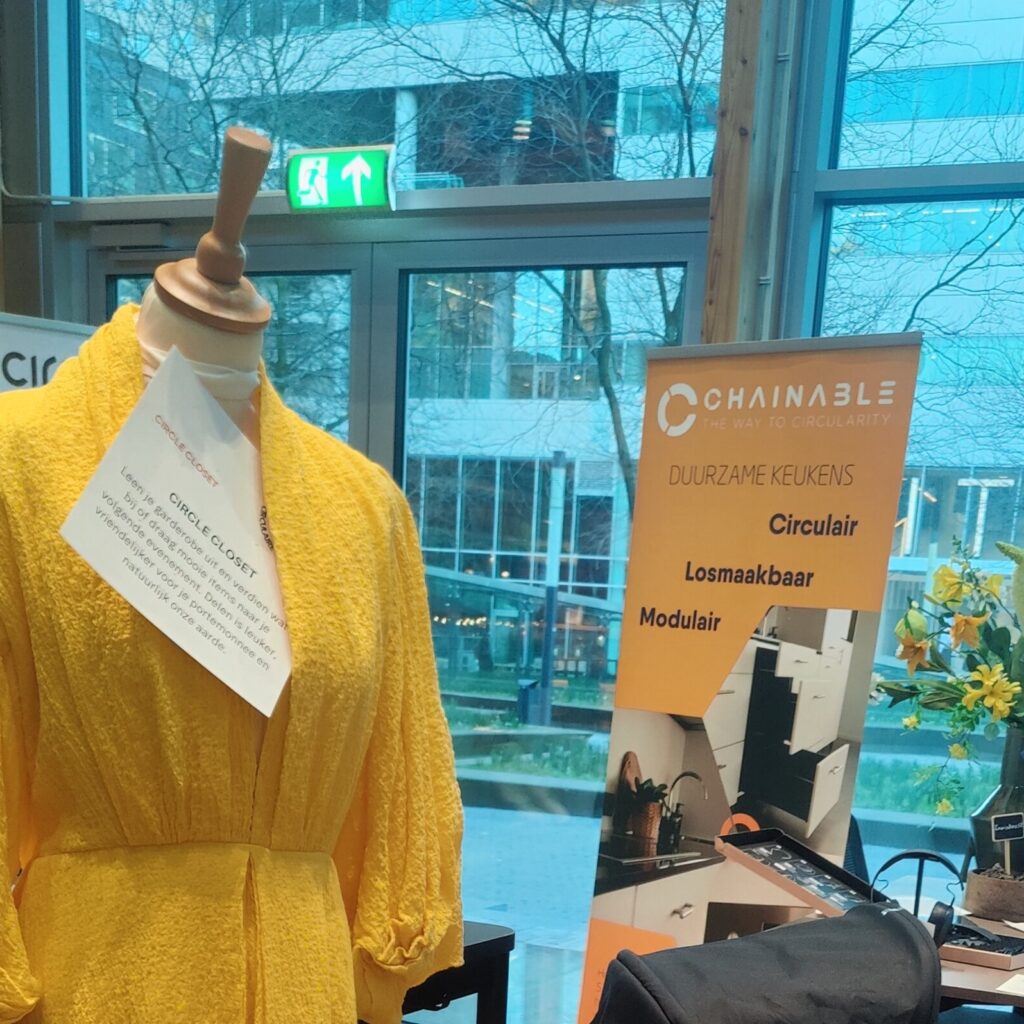 Het duurzame PR-bureau BLYDE maakt ook deel uit van de club. Impactadviseur bij BLYDE, Eva van Bruinessen, bestudeert een paspop met een gele jurk van CIRCLE CLOSET. Dit bedrijf verhuurt kleren om zo het weggooien van kleding te voorkomen. Van Bruinessen vertelt dat veel bedrijven zich onterecht als circulair voordoen. ‘Bij hen is circulariteit een leeg woord.’