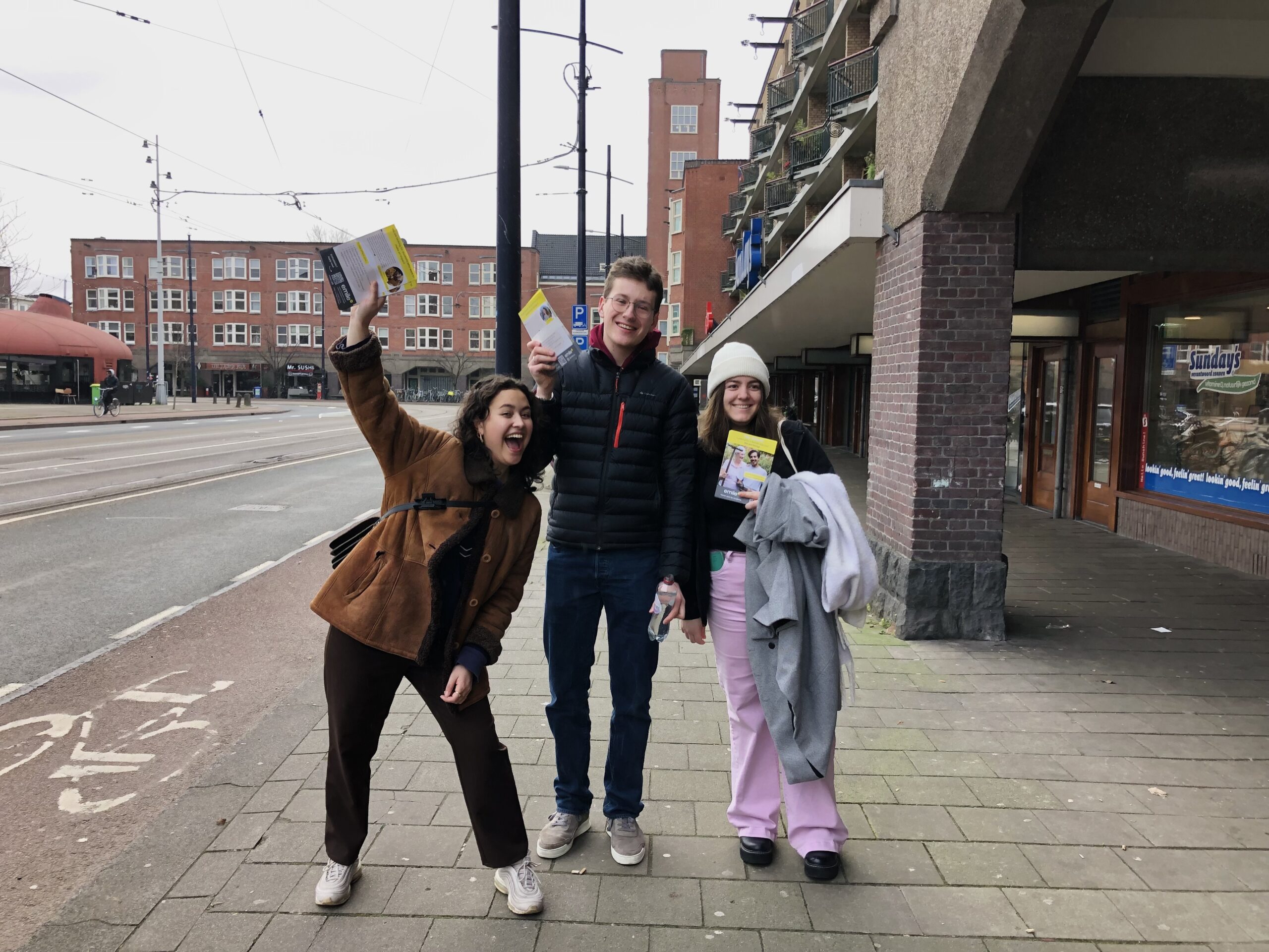 Bij Emile Thuiszorg werken studenten die huishoudelijke en persoonlijke zorg verlenen aan hun vaste cliënten. In de Amsterdam zijn zesentwintig verschillende wijken en in bijna elke wijk is de vraag naar hulp hoger dan het aanbod. Zo ook in Bos en Lommer. ‘We hebben een enorm personeelstekort. Ik merk het continu. Er staan veel diensten open, dus veel cliënten bellen, maar we hebben niet genoeg werknemers.’ Kamiel staat samen met zijn collega Maria Christianidi (24) voor de Albert Heijn op de Jan Evertsenstraat in Amsterdam Nieuw-West te flyeren om nieuwe personeel te werven. Zijn andere collega, Stephanie Blijleven (24), heeft besloten om naar Plein 40-45 te gaan om daar studenten aan te spreken.
