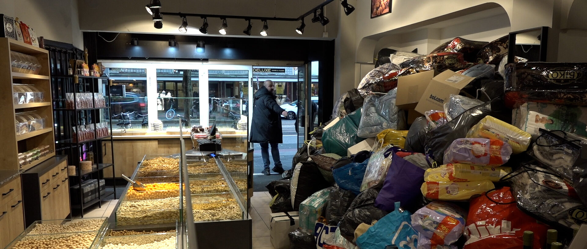 Sinds 14 uur ’s middags staat Demir als een bewaker voor zijn notenwinkel mensen weg te sturen. ‘Er kunnen echt geen spullen meer bij. De vrachtwagen is helemaal vol.’ Verslagen worden mensen met bakfietsen vol met tassen teruggestuurd. Auto’s en taxi’s worden gevraagd om te keren en op zoek te gaan naar andere inleverpunten. Om de paar minuten gaat Demirs telefoon af. ‘Nee sorry mevrouw, we kunnen echt geen spullen meer aannemen.’ De mensen die lopend komen, laat hij nog wel binnen. ‘Ik kan het niet maken om mensen met die zware tassen weer terug te laten lopen.’