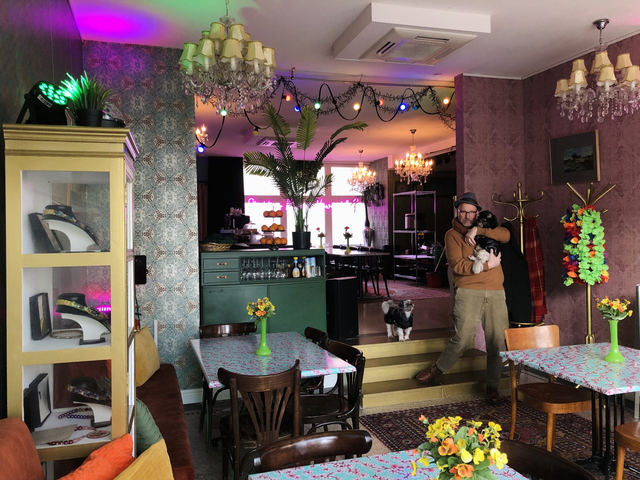 ‘Ik had opeens zoveel geld gekregen dat ik het hele pand mooi kon opknappen. Dat is gelukt. Zo hebben we Perzische tapijten gekocht, hangt er kunst aan de muur en hebben we een podium voorzien van een licht- en geluidsinstallatie. En kijk, mijn favoriet; het bellenblaasapparaat.’ Howard drukt op een knop en bellenblaas vult de ruimte. ‘Leuk, hè?’
