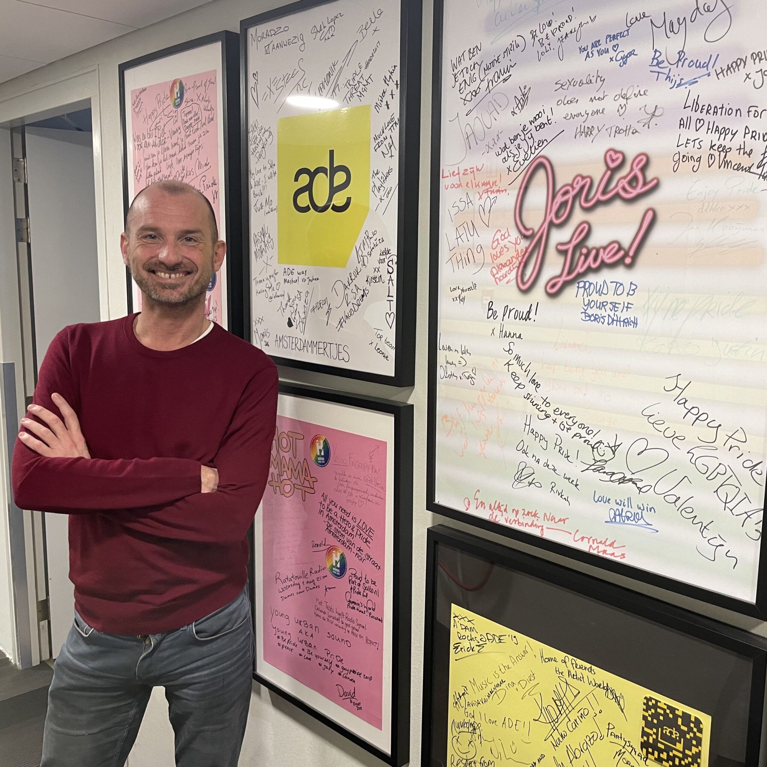 Joris van de Sande voor een muur met posters als aandenken aan succesvolle live-uitzendingen tijdens grote evenementen zoals Amsterdam Pride en Amsterdam Dance Event.