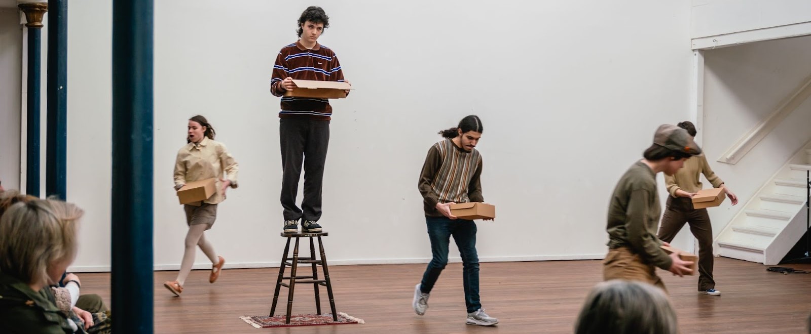 Acteur Toon Pilet staat boven op een antiek, donkerhouten krukje. Hij heeft, net als zijn medespelers een kartonnen schoenendoos vast. Het publiek zit in een U-vorm om het de voorstelling heen. ‘Ik durf te hopen dat ik in oorlogstijd ook in het verzet zou gaan, maar ik durf mijn vinger niet eens op te steken in de klas,’ zegt hij in de openingsscène . ‘Eigenlijk ben ik een egoïst met een empathische ambitie.’