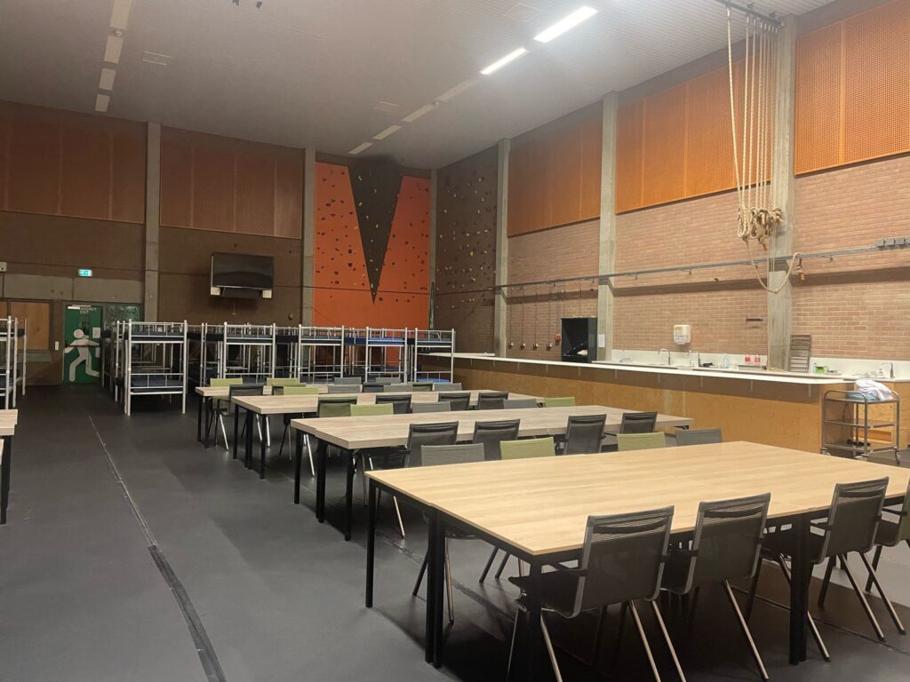 Pasje, het geluid van het slot, zakken leeghalen. Dan verder de TL-verlichte trap op. Halverwege een lange witte gang met veel deuren klinkt geroezemoes. In de gemeenschappelijke ruimte zijn de al aangekomen logés begonnen aan hun eerste maaltijd. Voor wie wil, volgt een tweede ronde om acht uur. Aan lange picknicktafels worden praatjes gemaakt. Hier en daar rolt iemand een sjekkie.