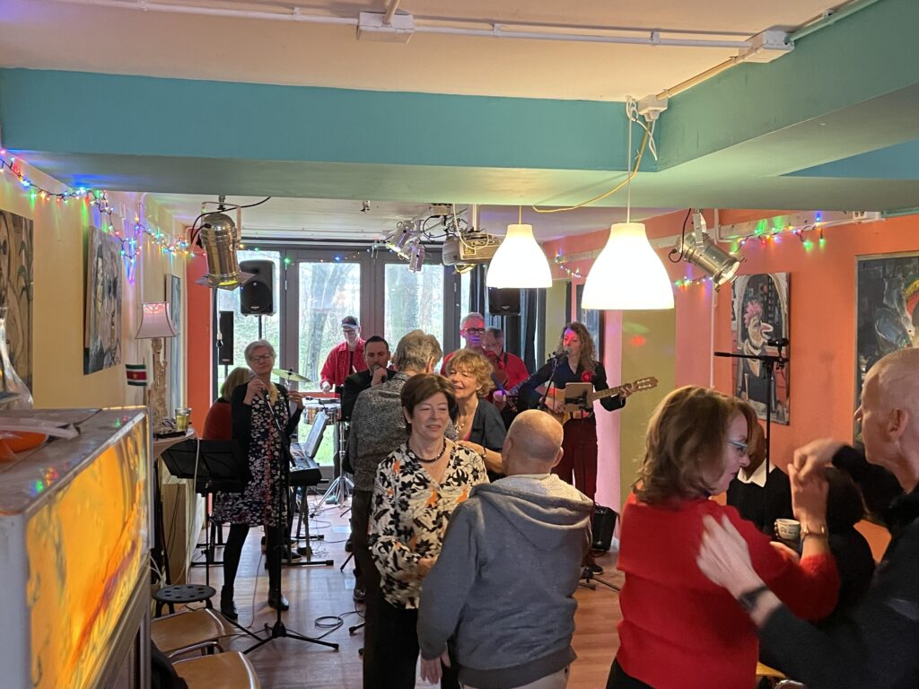Om de tafel eet de muziekgroep Son Nuevos na hun eerste set ‘een heerlijke kom pindasoep’. Ze zijn al vijf jaar bij elkaar. ‘Iedereen wordt blij van muziek. Dat bleek een krachtige verbindende factor te zijn.’ vertelt Karin Jensma, die vanaf het begin bij de band zit.