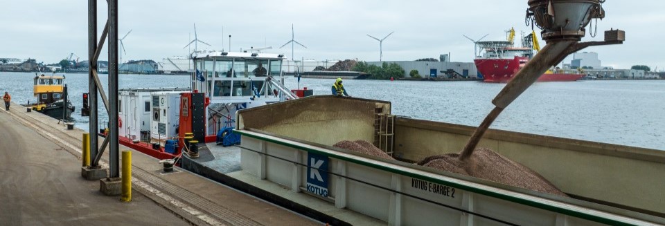 ‘Wij importeren cacaobonen uit West-Afrika. Die komen binnen in de Amsterdamse haven, maar die moeten uiteindelijk naar de fabriek in Zaandam. Voor dat laatste deel binnen de haven en over de Zaan gebruiken wij de E-pusher van het Nederlandse bedrijf Kotug, een volledig elektrische duwboot in combinatie met bakken, de E-Barges. De duwboot haalt de vracht op en brengt het in de bakken naar de fabriek.’