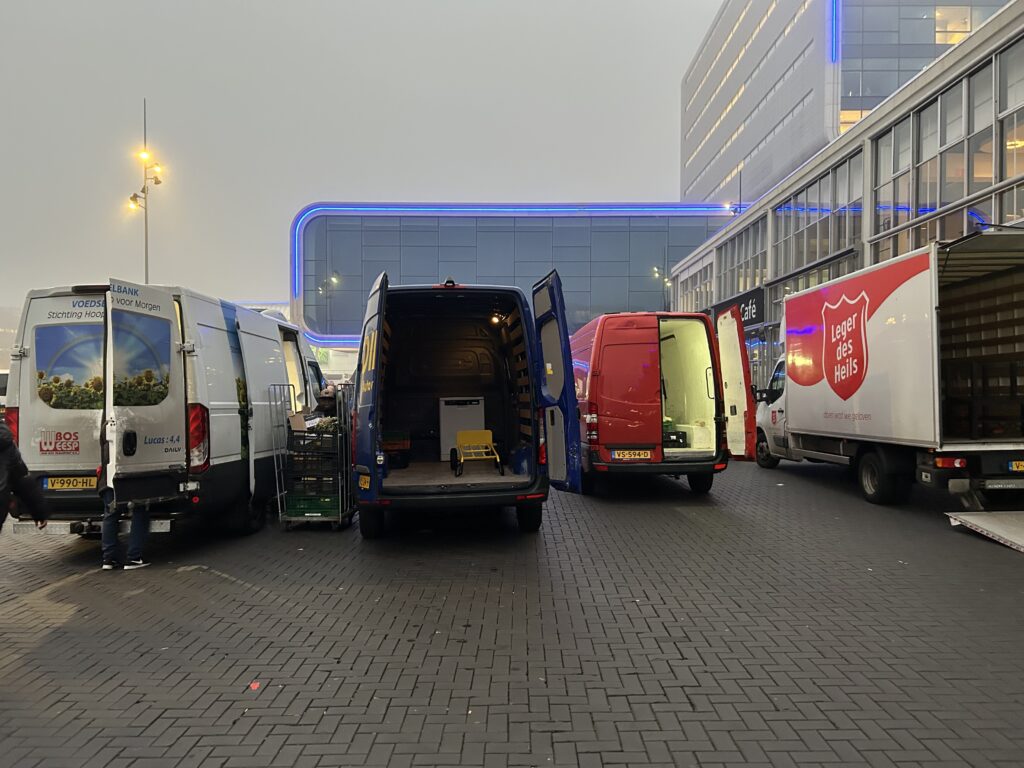 Om 16:45 rijden de busjes van de goede doelen voor. Het assortiment is ondertussen flink gegroeid: crackers, bier, ananassen, uien en enorme zakken met lege blikjes en flesjes voor het statiegeld. Stephanie Mathas slaat haar handen voor haar mond. ‘Oh, wat is het veel zeg!’ De vrijwilligers beginnen de spullen in te laden. Om 18:00 moeten zij plaats maken voor het afbouwteam, want dan wordt de beurs definitief afgebroken. De gedoneerde spullen die dan nog niet zijn meegenomen, worden vrijdag door de goede doelen opgehaald.
