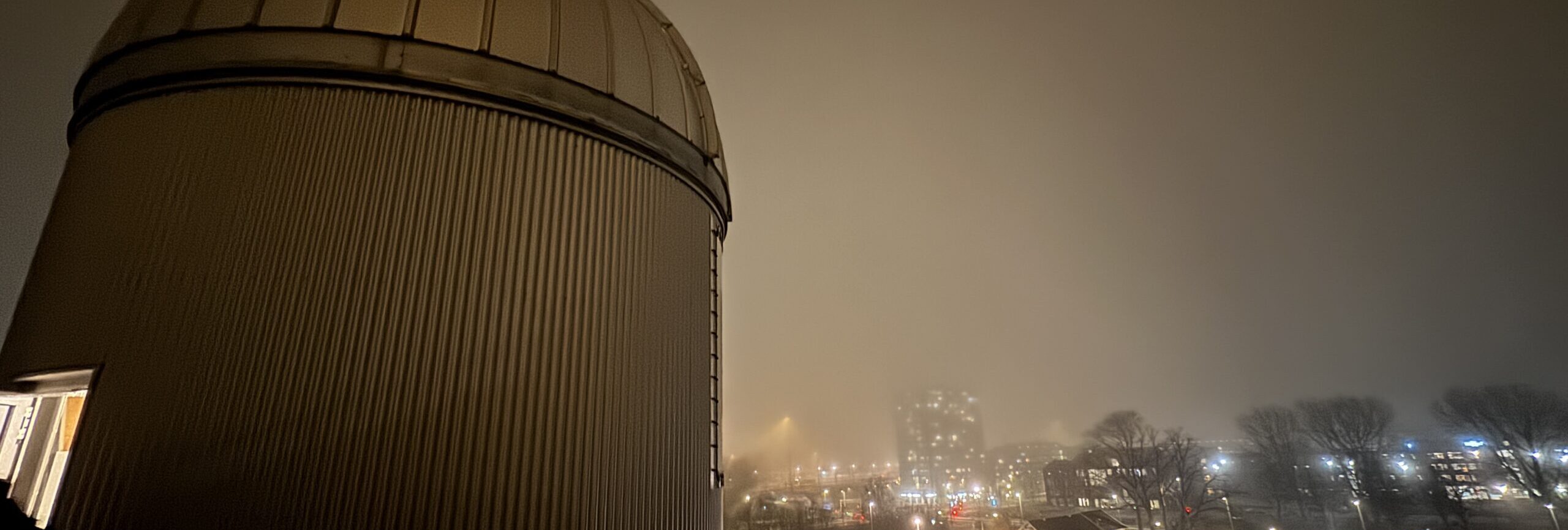 ‘Het lijkt wel Lowlands!’ zegt bezoeker Greetje van der Werf. ‘Ik zat klaar achter de computer toen de inschrijvingen opengingen voor vanavond, maar toch waren de vroege rondes al vol.’ Zelfs nu een hardnekkige mist al dagen boven de stad hangt, staan mensen te trappelen om een kijkje te nemen in het sterrenkunde-instituut aan de rand van Amsterdam.