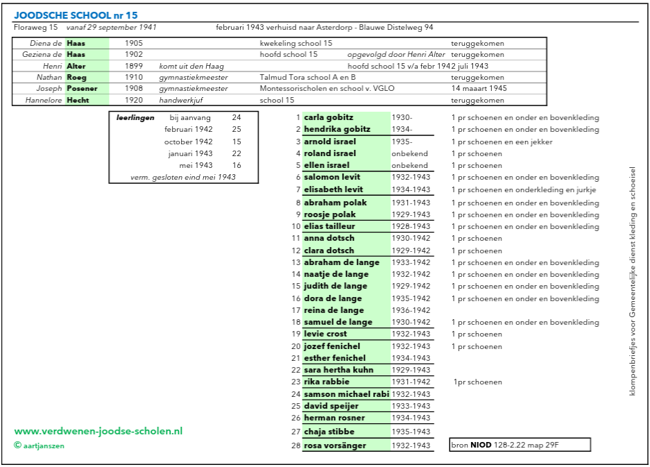 De meeste kinderen die sinds het begin op de joodse school zaten, zijn in 1942 of 1943 gedood en werden niet ouder dan 10 jaar. In het Holocaust Namenmonument aan de Weesperstraat zijn de 22 namen van vermoorde kinderen te vinden. Twee van de in totaal vijf leerkrachten die hebben lesgegeven op de school hebben het einde van de oorlog niet gehaald. Juf Geziena heeft de oorlog wel overleefd door onder te duiken in Rotterdam. In 1946 is zij aan de slag gegaan bij de basisschool in Schellingwoude, waar zij voor de oorlog ook werkte.