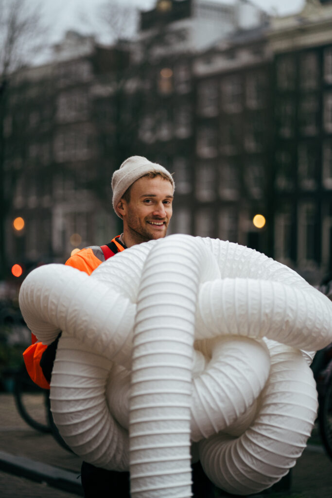 Het kunstwerk, gemaakt van een stuk ventilatieschacht, mondt uit in een knoop en gloeit in een veranderend patroon van kleuren boven de Prinsensluis. ‘Het bestaat bijna volledig uit prefab materialen, afkomstig uit de gevestigde industrie,’ zegt Gay trots. ‘De focus komt dan te liggen op het ontwerpen van de kleine verbindingen tussen de onderdelen, in plaats van de onderdelen zelf.’