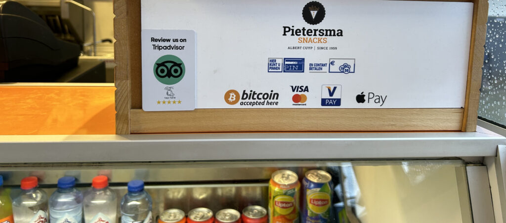 Op de Albert Cuypmarkt kom je met Bitcoin aan een frietje of een bitterbal bij Pietersma snacks. Eigenaar Jeroen Pietersma vertelt dat hij het vooral voor marketing doet, hij is zelf cryptofan en vindt het leuk om op de Bitcoin-map te staan.