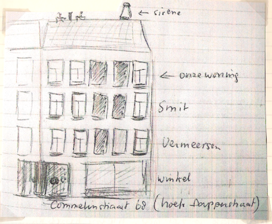 ‘Mijn moeder en ik woonden driehoog op de hoek van de Commelinstraat en Dapperstraat in Amsterdam Oost. Op het dak boven ons huis stond een sirene en als die begon te loeien konden we geen kant op. Er waren geen schuilkelders waren bij ons in de buurt, dus mijn moeder en ik knielden dan in de keuken op de grond om te bidden. We waren zo bang!’