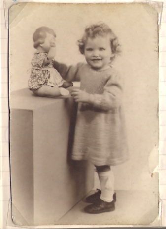 ‘Mijn vroegste herinnering is een bezoek aan de fotograaf. Ik had mooie nieuwe sportkousjes aan met kwastjes en liep aan de hand van mama. Zij was geboren in 1911 en groeide op in Zuid-Duitsland. Na de Eerste Wereldoorlog nam een joodse familie mijn moeder mee naar Amsterdam als dienstmeisje. De fotograaf verschool zich onder een zwarte doek en ik moest goed kijken of ik het vogeltje zag. Ik zag geen vogel en ik moest ook nog de pop teruggeven die ik mocht vasthouden. Ik moest toen erg huilen.’