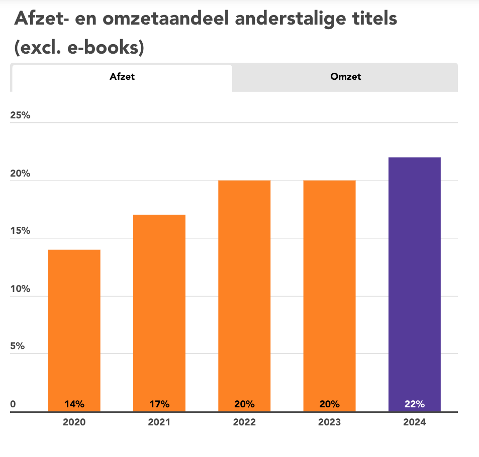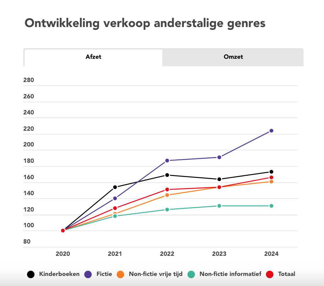 Terwijl de totale verkoop binnen de Nederlandse boekenmarkt stagneert rond 43 miljoen boeken per jaar, stijgt de verkoop van Engelstalige fictie explosief. Tussen 2020 en 2024 steeg de afzet met maar liefst 124 procent, zo blijkt uit recent onderzoek van KVB Boekwerk. Onder jongeren is de tendens nog sterker: zij lezen de helft van hun boeken in het Engels. Dit tegenover een kwart bij dertigers, afnemend tot slechts vijf procent bij oudere lezers.