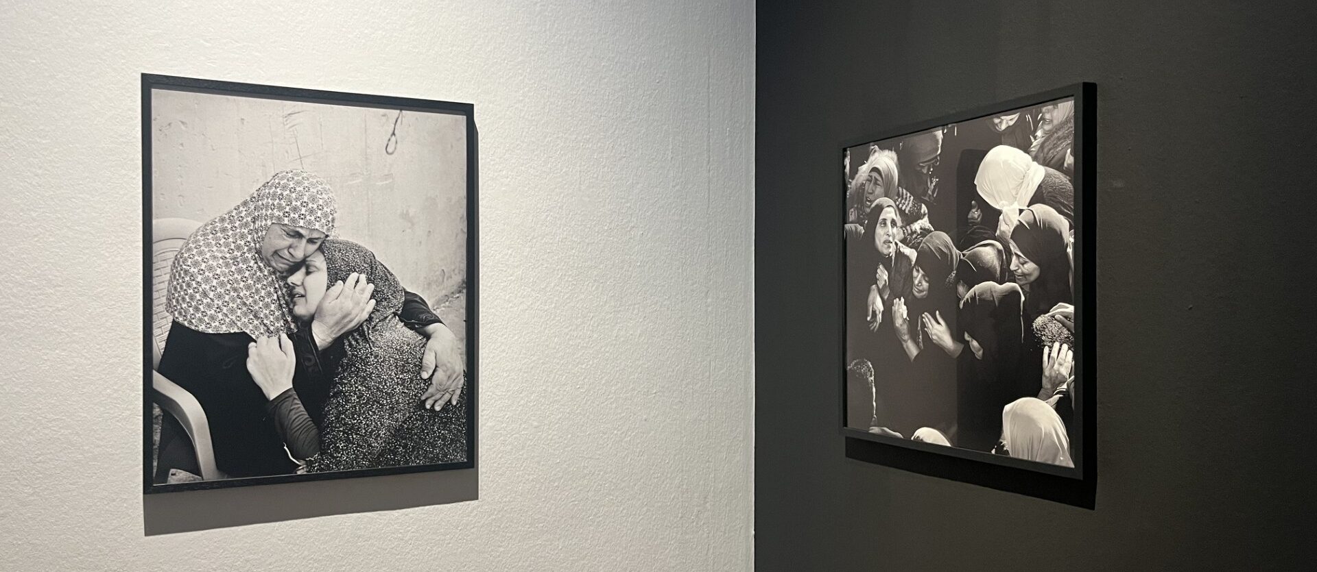 In de expositieruimte van Khader is nauwelijks beweegruimte door de drukte, maar toch is het stil. Zwart-witfoto’s van de moeders en hun overleden zonen hangen naast elkaar. Op een filmdoek wordt de begrafenis van een van de jongens getoond. Af en toe klinkt er een snik vanuit het publiek.
