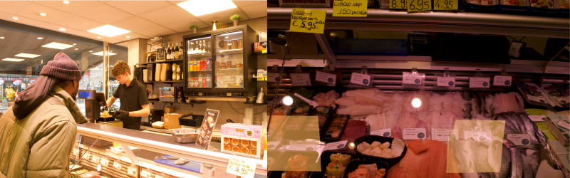 Bij Vishandel Smit aan de Eerste Constantijn Huygensstraat, moesten visboer Jesper Runderkamp (22) en zijn collega snel schakelen. Met ijs werd alle vis veilig verpakt, en klanten die nog langs kwamen en contant geld bij zich hadden, konden afrekenen. Lachend vertelt Jesper hoe ze de vis op een te klein digitaal weegapparaat wogen en de prijzen met een rekenmachine bepaalden. Maar tegen 17.00 uur werd het donker buiten en bleef de winkel leeg. Jasper en zijn collega besloten de winkel te sluiten. Hij trekt zijn schouders op: ‘Het was een drukke dag, zonde van de laatste paar uur.’