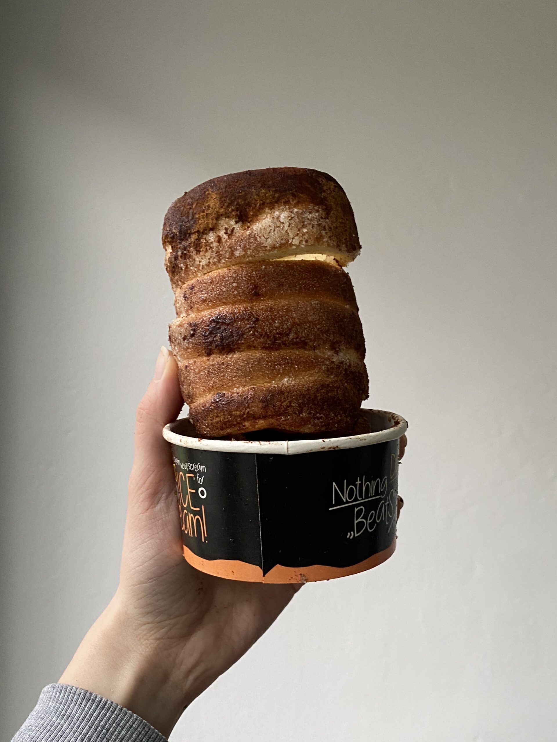 De tweede poging dan: de chimney cake met kaneel. Een deel van de wederom dikke laag topping blijft aan mijn tong plakken. Het smaakt wel beter dan de zogenaamde klassieke variant, alhoewel ik vooral denk dat dat komt omdat deze niet smaakt alsof ik pure suiker eet.
