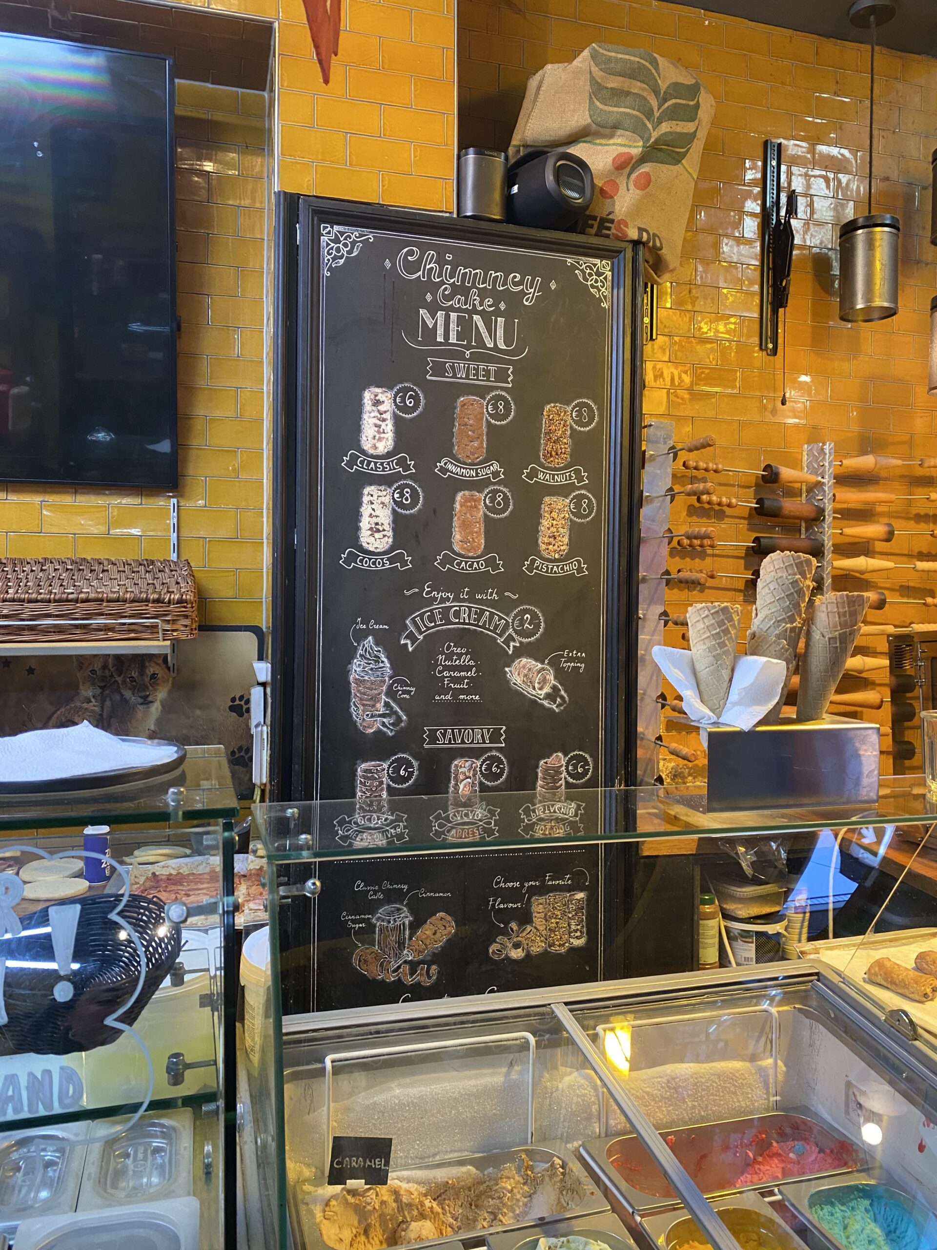 Op naar de Warmoesstraat. Het café is rustig op donderdagochtend, met alleen een paar toeristen. Meteen bij binnenkomst begin ik te fronsen. Naast chimneycakesmaken die ik gewend ben, zoals kaneel en cacao, staan ook hartige smaken op het menu. Chimney cakes met olijven en kaas en – ik durf het bijna niet op te schrijven – hotdog. Eentje met kaneel en een ‘klassieke’ dan maar. Bij het afrekenen komt de tweede frons: voor de twee chimney cakes ben ik 14 euro kwijt – 6 euro voor de klassieke en 8 voor die met kaneel. In Hongarije kost een kürtőskalács zo’n 2 euro.