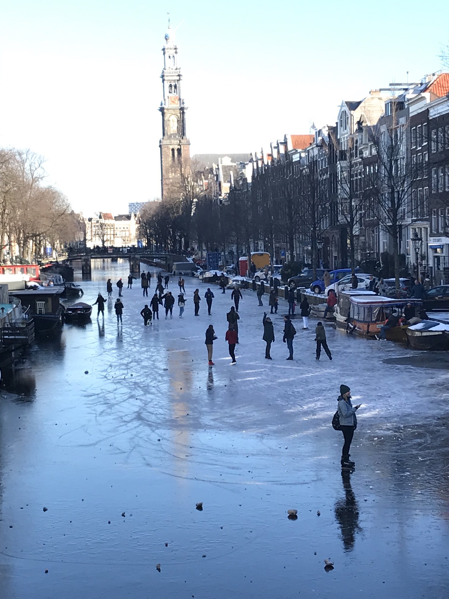 De eerste schaatsers hebben zich zaterdagochtend op de Prinsengracht gewaagd. Ook op de Egelantiersgracht wordt geschaatst, maar wel met risico op een nat pak: het ijs is slechts enkele centimeters dik.