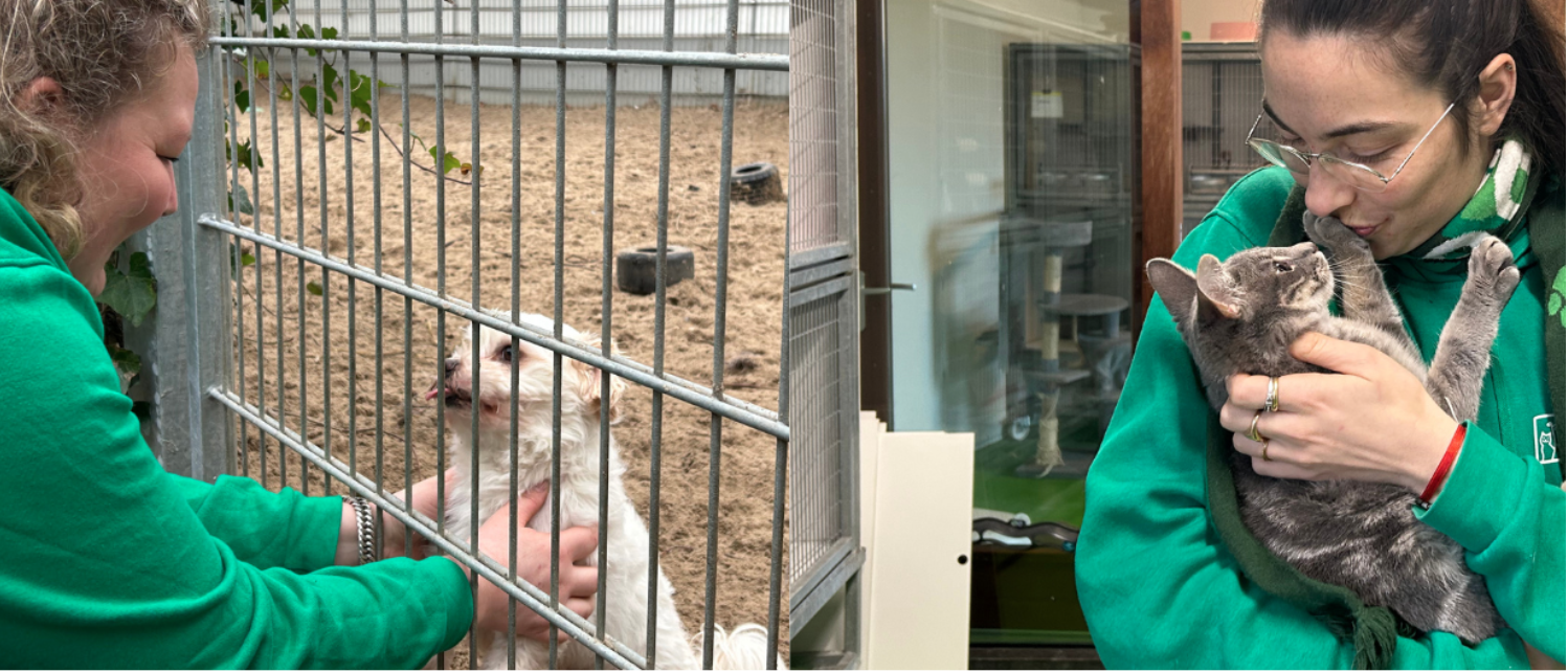 Gehuld in de grauwe mist doemt het felgroene gebouw van het grootste dierenasiel van Nederland op, het DOA. Per jaar vangt een team van bijna 450 medewerkers, waarvan vierhonderd vrijwilligers, duizenden huisdieren op. Esther Balfoort (31) werkt er al twaalf jaar en is voornamelijk te vinden op de hondenafdeling. ‘Het begon als parttime baantje. Ik studeerde communicatie, maar toen er na mijn studie een aanbod kwam om hier meer uren te gaan draaien, greep ik die kans. Mijn hart ligt toch bij de dieren.’
