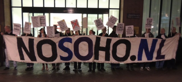“Wie helpt er mee demonstreren tegen het Soho House hotel? Om 19.00 uur borden ophalen bij Rob en Hans! Daarna naar het stadhuis! AT5 komt!” Met koeienletters staat het op een A4’tje in de hal van het appartementencomplex aan de Amsterdamse Raamgracht.