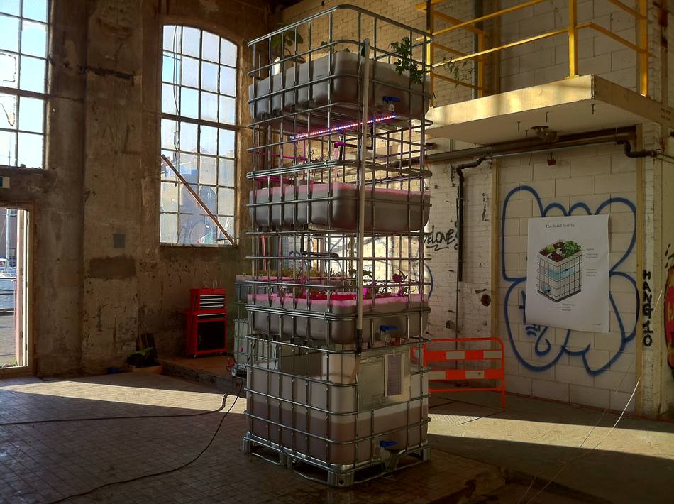 In een oude fabriekshal in het Oostelijk Havengebied staat een aquaponicsboerderij: een boerderij waar planten en vissen worden gekweekt door middel van een geënsceneerd ecosysteem. Aquaponicsboeren met Ipads houden de stand van zaken in de gaten. “Fish and lobster in Tower 3 are happy!”