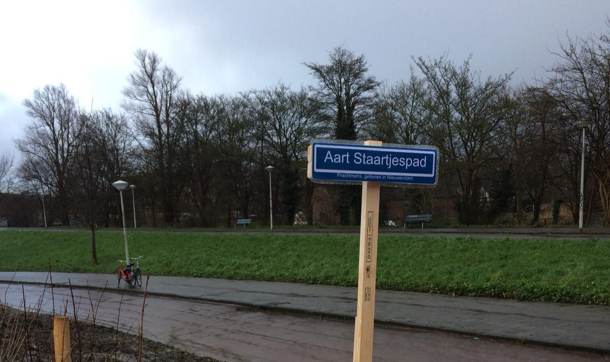 AMSTERDAM – Op zaterdagmiddag werd in Nieuwendam in Amsterdam-Noord het Aart Staartjespad onthuld: een officieus eerbetoon aan de vorige week overleden acteur en regisseur die in de wijk geboren werd. Het pad is een paadje – het fungeert als oprit naar een nieuwgebouwd verzorgingstehuis – maar voor buurtbewoners is het een aandenken aan Staartjes als artiest en als Nieuwendammer.