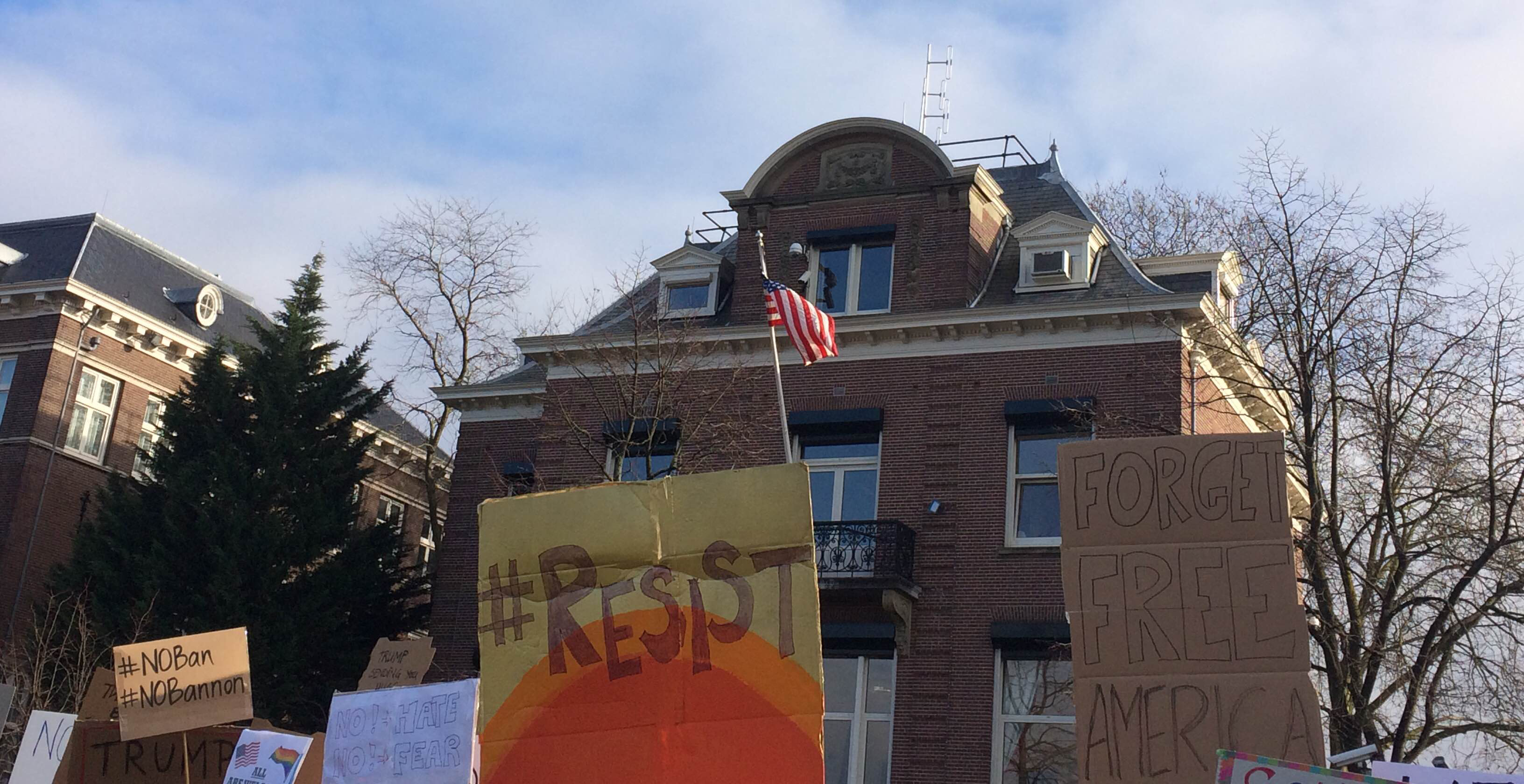 Zo’n honderdvijftig mensen demonstreerden dinsdagmiddag voor de deur van het Amerikaanse consulaat aan het Museumplein tegen de ‘muslim ban’ van president Donald Trump