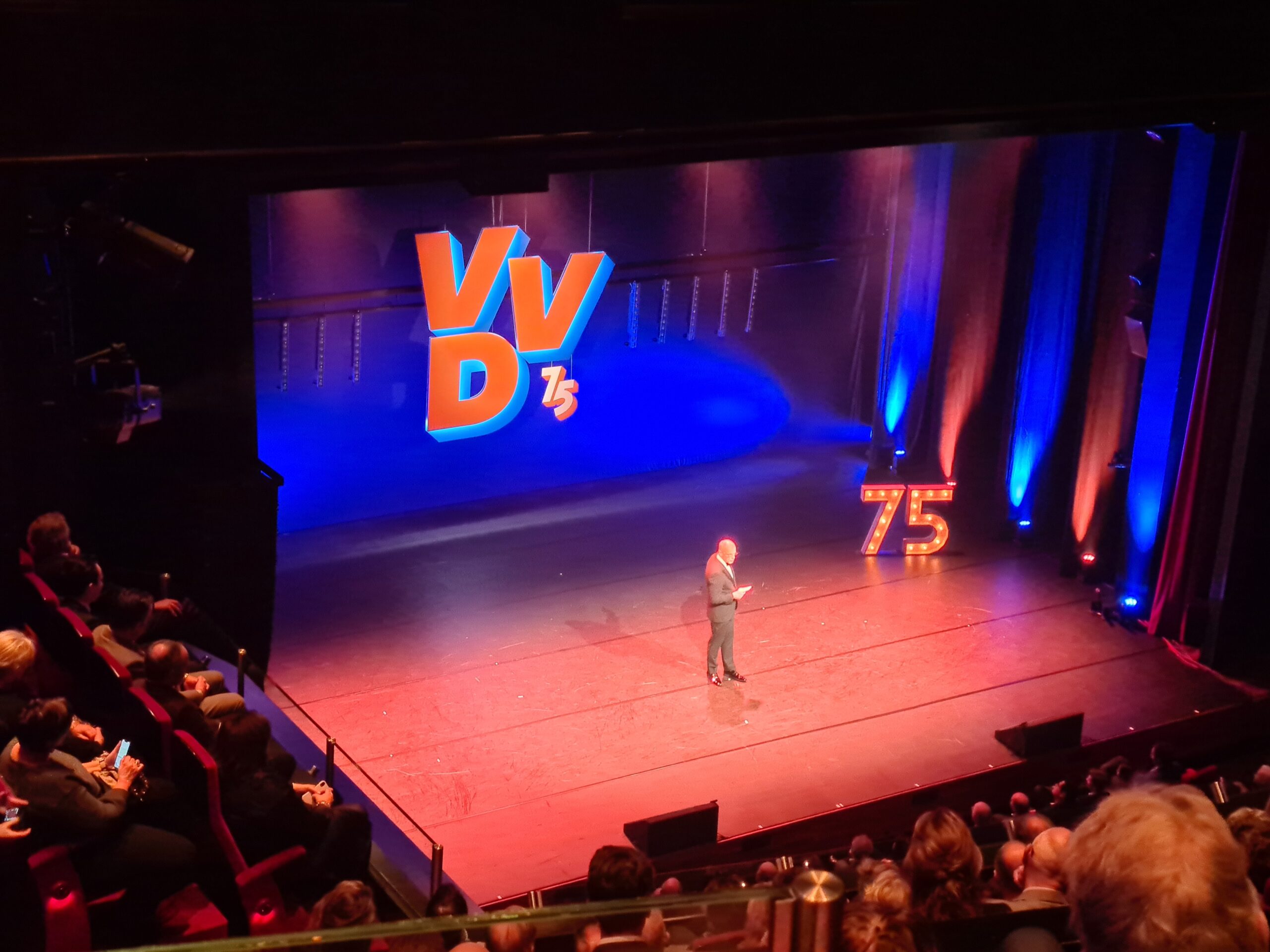 De VVD vierde in het DeLaMar Theater haar 75e verjaardag. Over een mogelijke opvolger van Rutte werd niet gesproken. ‘Er lopen hier veel mogelijke opvolgers, maar we hebben nog geen vacature.’