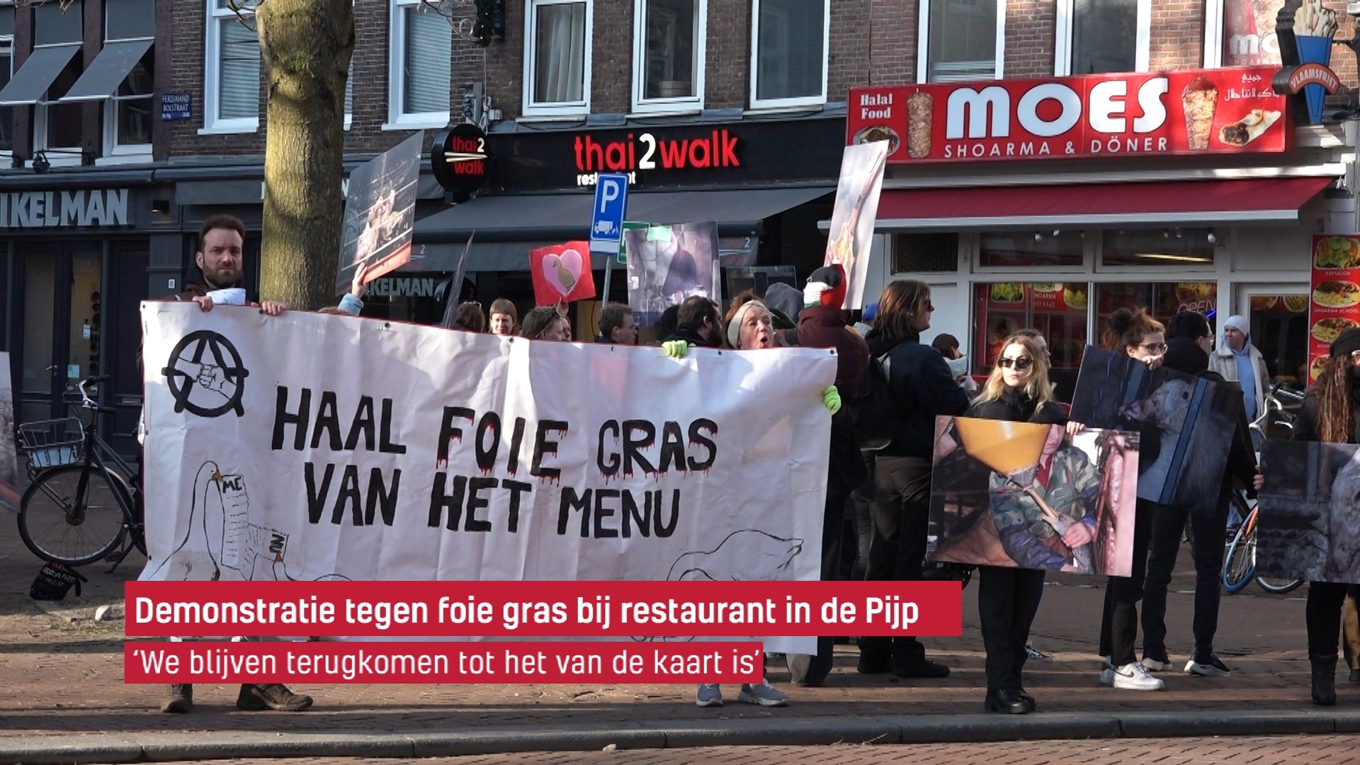 Demonstratie tegen foie gras bij restaurant in De Pijp